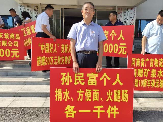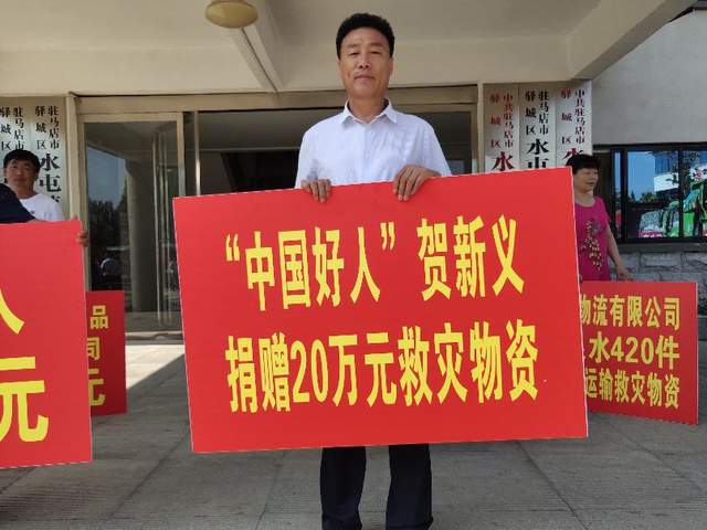 水屯镇孟庄村支部书记、“中国好人”贺新义捐赠的包括大吸力排水泵10台、水袋40盘、卡子80个、结头40个、口罩1万只、卫生纸500提、牙刷牙膏各1000只、探照灯(头灯)500只、白猫消毒液1300瓶、达利园瑞士卷800件(1600小提)在内的20万元救灾物资;