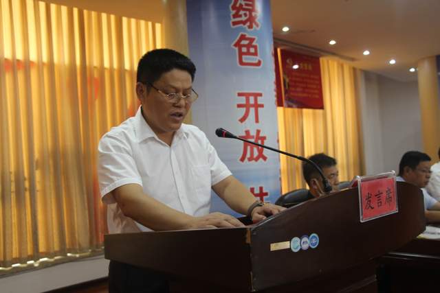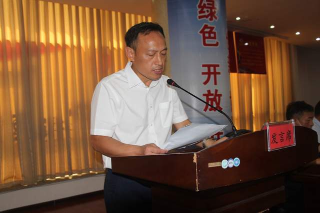 鄂城区樊口商会名誉会长、顾地科技有限公司董事长武校生代表鄂城区樊口商会宣读发起“讲诚信、比贡献、树形象”倡议书。