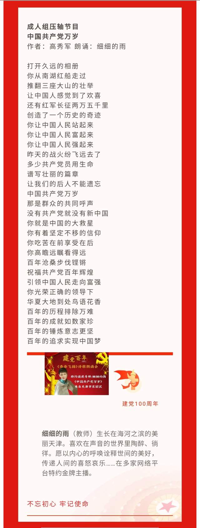 7.《中国共产党万岁》作者:高秀军 晚会压轴嘉宾:细细的雨 ——来自天津市