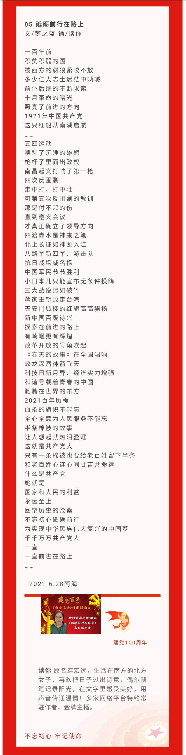 5.《砥砺前行在路上》作者:梦之蓝 朗诵:读你 ——来自深圳