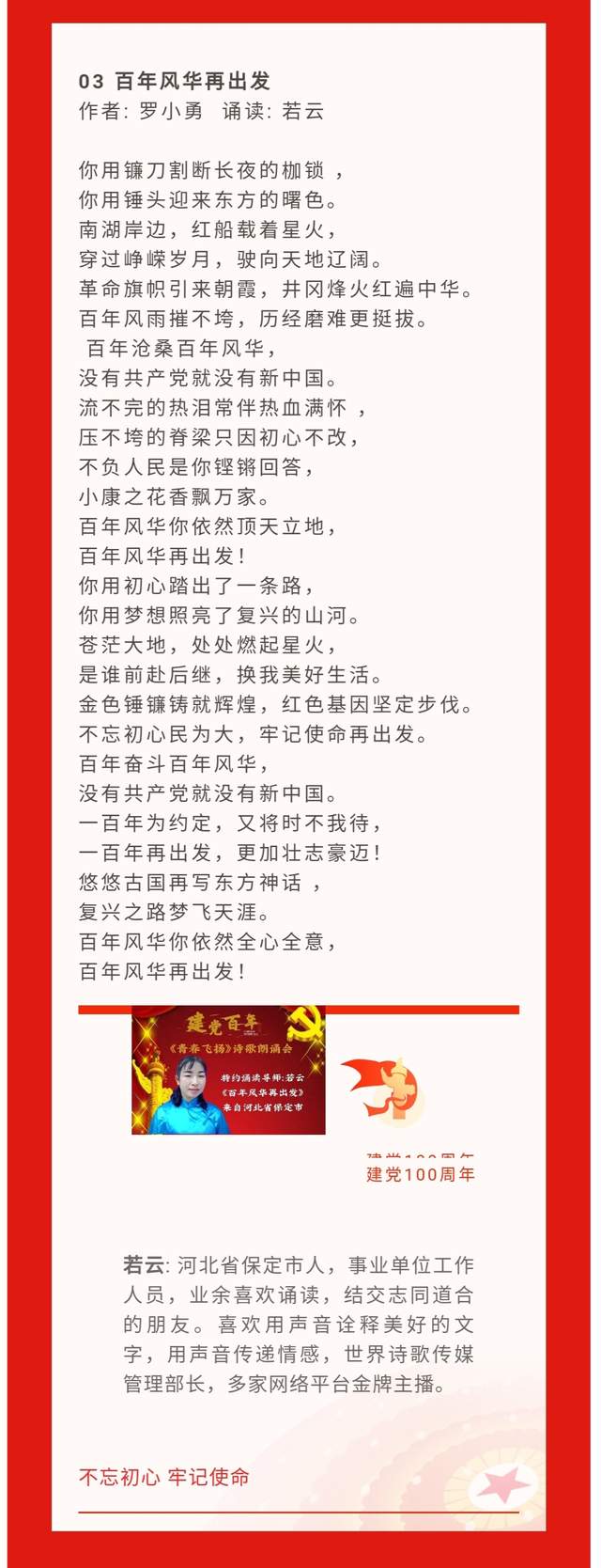 3.《百年风华再出发》作者:罗小勇 朗诵:若云 ——来自河北省保定市