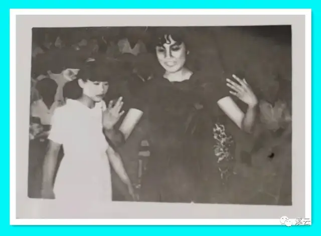 这张照片,是我们演出结束后的合影,照片中的我,非常幸福地坐在李老师前面,李老师双手扶着我的肩膀。