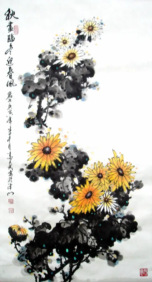 高天武老师擅画花鸟、虫鱼、笔墨雄浑滋润,色彩浓艳明快,造型简练生动,意境淳厚朴实。所作鱼虾虫蟹,天趣横生。笔酣墨饱,力健有锋。尤功虾蟹、鱼、花鸟、水墨淋漓,洋溢着自然界生机勃勃的气息。山水构图奇异不落旧蹊,极富创造精神。