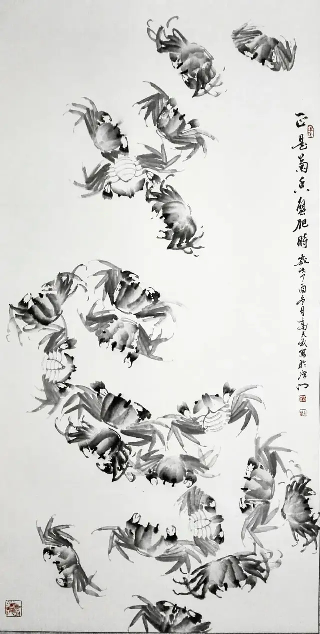 高天武老师用笔的变化,使虾的腰部呈现各种异态,有躬腰向前的,有直腰游荡的。也有弯腰爬行的。虾的尾部也是寥寥几笔,既有弹力,又有透明感。虾的一对前爪,由细而粗,数节之间直到两螯,形似钳子,有开有合。虾的触须用数条淡墨线画出。对水中的虾,为表现出那种透视感,高天武老师的线条有虚有实,简略得宜,似柔实刚,似断实连,直中有曲,乱而有序,纸上之虾似在水中嬉戏游动,触须也像似动非动。节奏的由粗渐细。那精确的体态,富有弹力的透明体,在水中浮游的动势……可以说,艺术造型的“形”、“质”、“动”三个要素都臻于完美的境界。