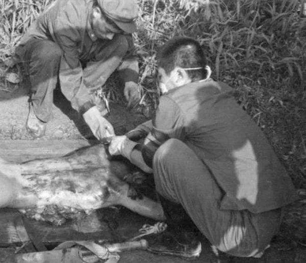“开午饭了!开午饭了!”炊事班杨班长与炊事员小胡抬着饭桶来到战地救护所,我和雷端亚、冯小萍处理完一具战友的遗体后,走到身后的沟边洗了手,回身接过杨班长递过来的饭碗取饭时才发现,一桶的饭几乎全是粉红色的,略略还带有一股血腥味,我问杨班长怎么回事?他解释说:“你们战地救护所在上面,我们炊事班在下面,这山上就这么一条小水沟,你们为战友清洗遗体的血水将一条沟里的水都染红了,我们不用这水煮饭那里还找得到水啊!”,听他这么一讲我恍然大悟,心想这是战争啊!还讲究什么。但真吃时心里那股滋味就不用提了,既复杂又难受,还伴着心翻。难受的是饭里有战友的血啊!心翻的是血腥味太浓。为了吃下饭,我将一军用罐头里的菜全倒进饭里,搅了搅后一口气吃了下去,这顿饭可以说是伴着泪水噬下的,二位女战友只吃下一半就再也吃不下去了!女兵是要骄气些,但我理解她们,在我的眼里她们也非常勇敢了。