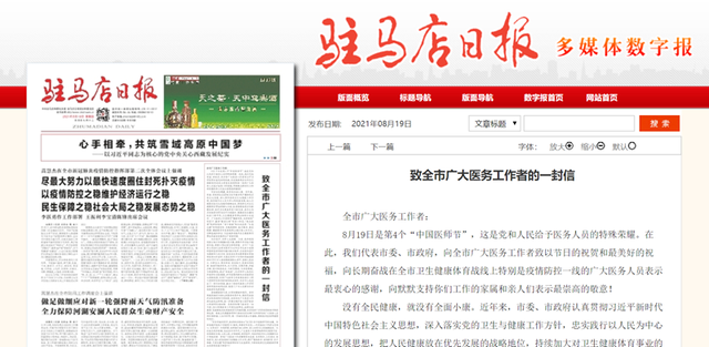 8月19日是第四个“中国医师节”,这是党和人民给予医务人员的特殊荣耀。市委书记蒿慧杰,市委副书记、市长李跃勇发出《致全市广大医务工作者的一封信》,代表市委、市政府,向全市广大医务工作者致以节日的祝贺和最美好的祝福,向长期奋战在全市卫生健康体育战线上特别是疫情防控一线的广大医务人员表示最衷心的感谢,向默默支持工作的家属和亲人们表示最崇高的敬意!