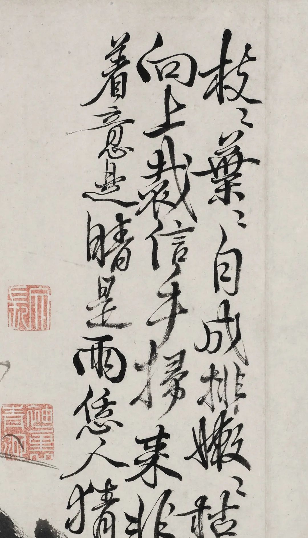 徐渭借助大写意的水墨技法,突出地体现了文人画的特质,尤其是他画竹子、荷花、芭蕉、石榴、葡萄之类题材的作品,更是将他的才情借着淋漓的笔墨在纸上渲泄无遗,一诗一画,堪称徐渭水墨写意花卉的精品。