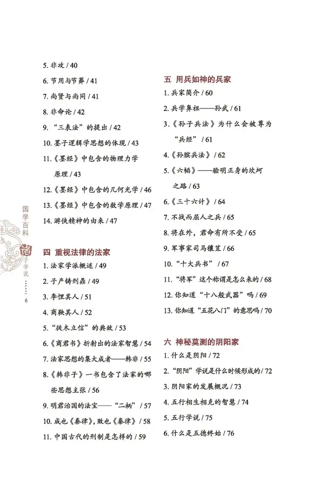 《国学百科》丛书共9册,包括《儒家先哲》《诸子学说》《文学殿堂》《艺术之林》《科技制作》《史地撷英》《岁时节令》《人生仪礼》《衣食文化》。它深入浅出,以图辅文,可读性很强;它内容充实,篇幅精短,重点突出。它既可以作为国学的普及读物,也可以作为查阅相关资料的工具书,使读者在较短的时间内获取有益的知识。