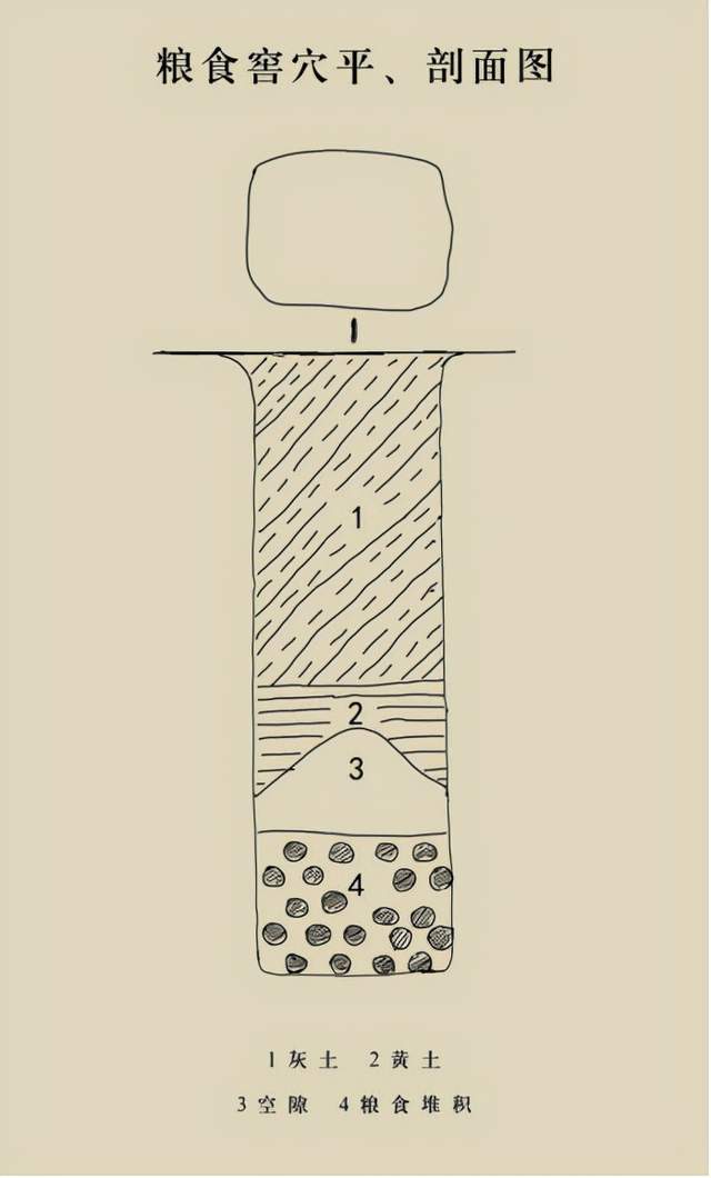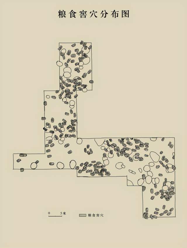 从1976年到1986年的三次正式发掘中,发现了许多圆角长方形窖穴,其中有189个(1976—1978年88个,1985年为37个,1986年为64个),窖穴内有粮食堆积。在1976年—1978年发掘的2579平米中,发现粮食窖穴88个,平均29.31平方米一个,在1985年发掘的900平方米中,发现37个,平均24.32平方米一个,在1986年发掘的890平方米中,发现64个,平均14.14平方米一个。并且无论从哪个方向起掘开方,都会碰到粮窖,说明粮窖分布很广,但不均匀。