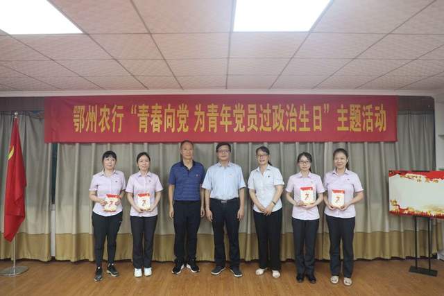 在祖国母亲生日到来之际,鄂州农行团委组织开展“青春向党 为青年党员过政治生日”活动,“十个一” 为青年党员过好政治生日。市分行党委委员、纪委书记刘正运,“全国金融五一劳动奖章”获得者姜燕、市分行计划财会部总经理严忠、网点办主任汪红霞、办公室主任/团委书记甘先明,各一级支行(直管支行)团支部书记,过政治生日、自然生日的青年党员,市分行团委全体成员及特邀老党员参加活动。