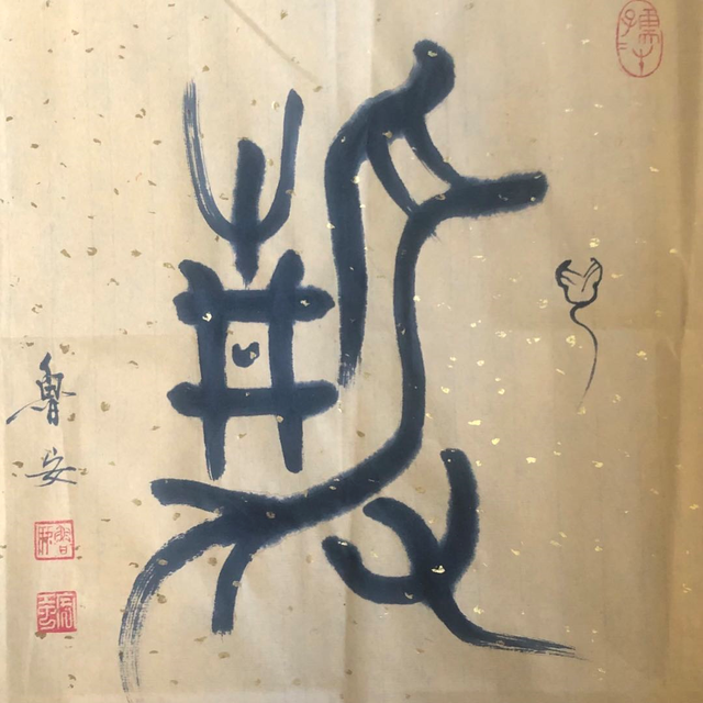 (圖2, 心靜的靜字, 靜為青的表意字, 表示純淨. 早期青, 清通用, 靜字源為青, 加爭字, 意在清心, 需要與自己的慾望抗爭, 右邊的爭字上下表示左右兩手, 為中間的樹枝在角力, 為爭, 作者魯安書寫)