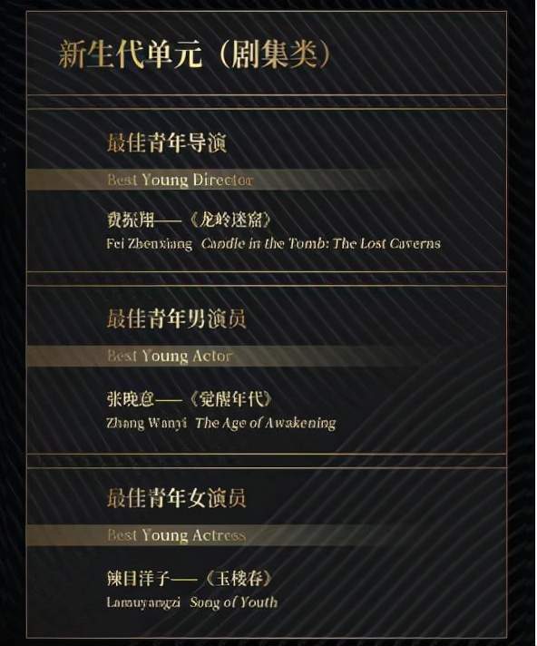“新生代单元”(电影类)奖项中,刘浩存凭借电影《一秒钟》中刘闺女一角获得最佳青年女演员奖,王仁君凭借在电影《1921》中对毛泽东的演绎获得最佳青年男演员奖;在“新生代单元”(剧集类)的奖项争夺中,电视剧《觉醒年代》陈延年的扮演者张晚意获得最佳青年男演员奖,辣目洋子凭借电视剧《玉楼春》吴月红一角获得最佳青年女演员奖;电影《革命者》的导演徐展雄获得最佳青年导演(电影类)奖,《龙岭迷窟》的导演费振翔荣获最佳青年导演(剧集类)奖。