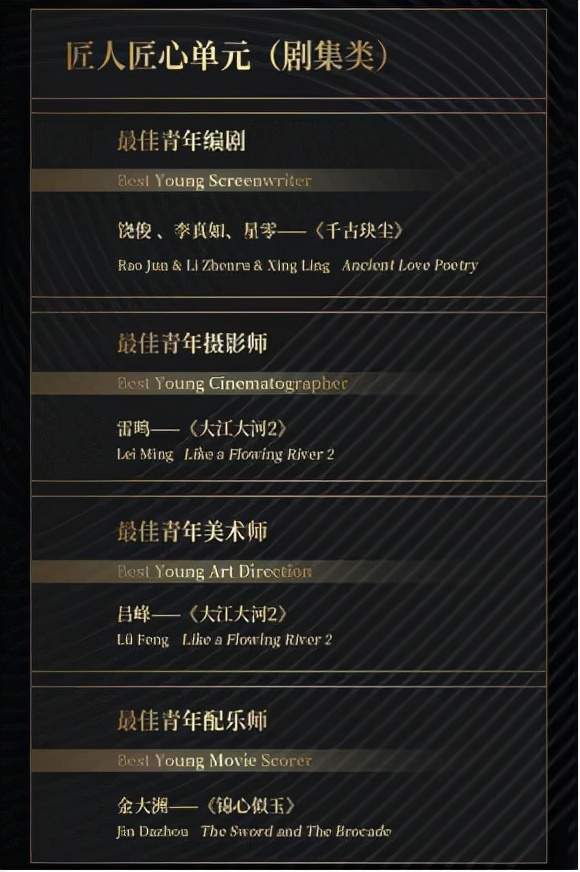 在“匠人匠心单元”,贾玲、孙集斌、王宇、刘宏禄、卜钰、郭宇鹏,凭借由编剧根据真实故事创作的电影《你好,李焕英》获得最佳青年编剧(电影类)奖;饶俊、李真如、星零凭借电视剧《千古玦尘》编剧荣获最佳青年编剧(剧集类)奖。电视剧《大江大河2》摄影雷鸣、美术师吕峰分获最佳青年摄影师(剧集类)、最佳青年美术师(剧集类)奖。