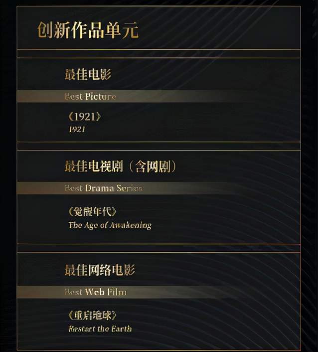 创新作品单元中,成龙作为嘉宾为最佳电影奖颁奖。电影《1921》以“全景”视角展现百年前开天辟地的时刻,最终不负众望获得此奖项。最佳电视剧(含网剧)奖花落《觉醒年代》,该剧播出后口碑持续攀升,网络热度不断走高。也可见近期高口碑主旋律作品频现,以其时代回响引发观众强烈共鸣,获得市场认可。此外电影《重启地球》获得最佳网络电影奖,有趣而有深意的设定也让观众看见了国产科幻电影的更多可能。