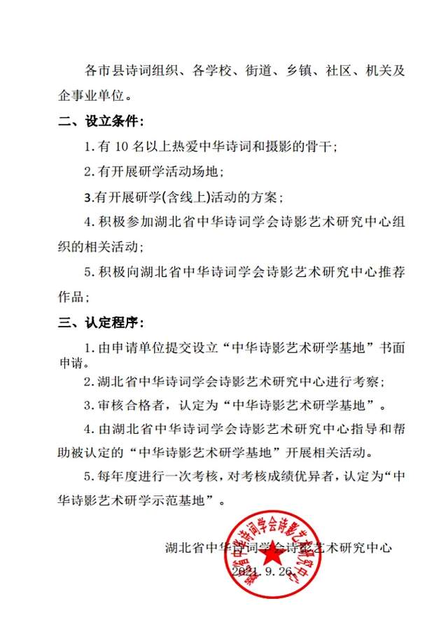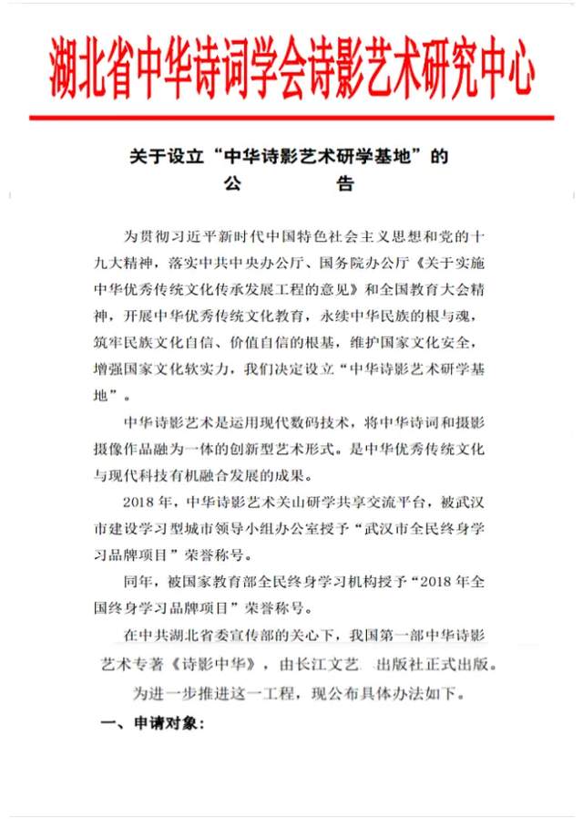 湖北省中华诗词学会诗影艺术研究中心热诚欢迎符合基本条件的各诗词组织、各学校、街道、乡镇、社区和单位积极申报,我们将竭诚为各研学基地做好服务,共同为弘扬中华优秀传统文化,丰富人民的文化生活,作出应有的贡献。