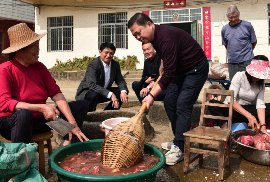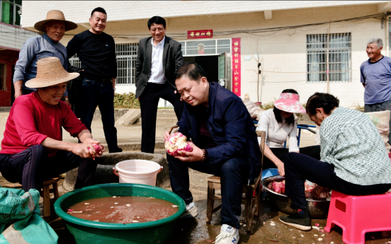 观此景,“好大的红薯,真的舍不得放下!”村民告诉记者,宋书记经常在大会小会上对我们说:“苏垴要实现乡村振兴,就必须从低效农业向高效农业发展,变零散种植为连片种植,在方圆800多亩耕地上走出一条符合乡村振兴的成功之路”。