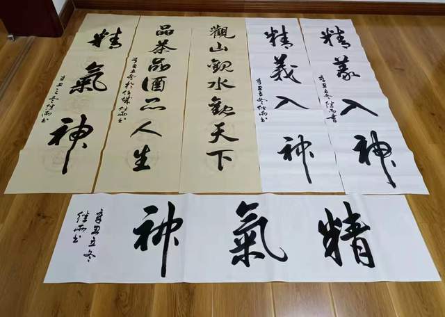 清发兄练笔心切,到得最早,笔者到时场,他已与继雨兄论道甚欢,且小有所成:竖联,斗方,字与字的变化,点与横的配合,起笔立魂,收笔入仓,竖因瘦而生险,撇因柔而生媚……继雨兄口若悬河,纵论书道,从竖联“精气神”击鼓开道,中闯斗方“见贤思奇”、“茶能清心”、“书中悟道”、“墨海游龙”、“室雅兰香”五关六将,终以“海纳百川”鸣锣收兵……“坐而论道”,太平;“立而论道”,太硬;唯“习而论道”,甚切,甚欢,甚用!
