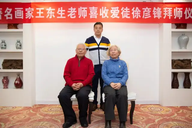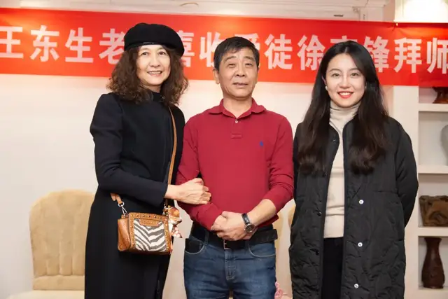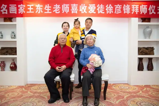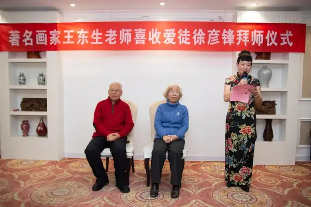 拜师仪式简单而气氛热烈,由著名女画家、京津书画院秘书长黄雅丽主持。首先徐彦锋给老师王东生与师娘蔡世菊女士行过拜师礼,之后敬茶、献花、师徒互赠礼物、发表感言;最后徒弟携夫人闫丹艳女士与老师、师娘合影留念。