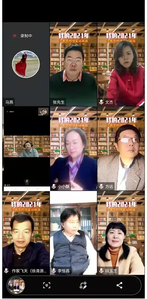 2021年11月11日“我的2021”——济南签约作家谈收获通过腾讯会议系统线上举行。方远、苏雨景、飞天、段玉芝、李恒昌、张宝中、吕仁杰、吴苹8位签约作家分享了签约以来的创作收获。共40余位作家、文友参加活动。
