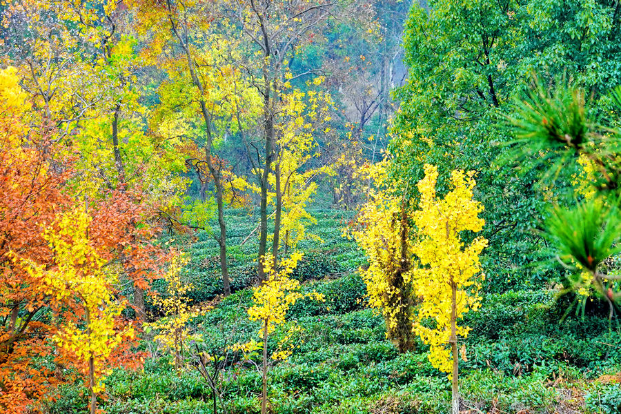 初冬之时,陪同友人又到此一游。入冬不久,尚似深秋。登上山顶的听风亭观景,烟雨朦胧中,在茶田绿的映衬下满眼嫣红杏黄,真是赏心悦目。
