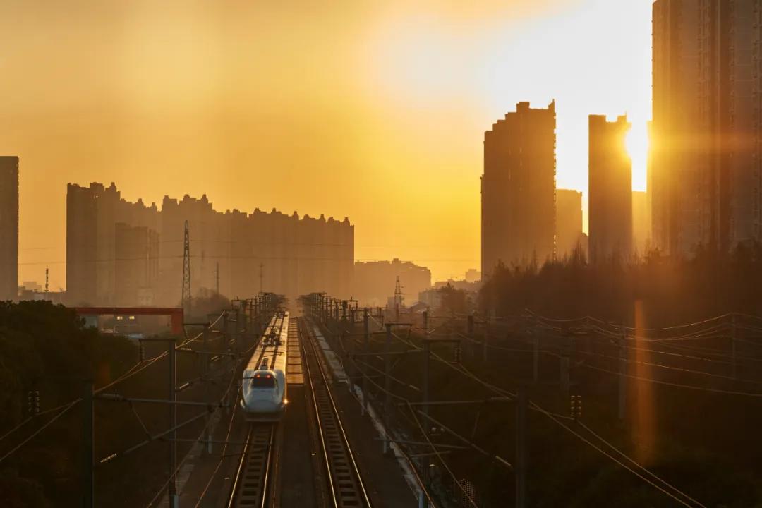 在江苏省常州市,一列动车组列车沐浴朝阳的光辉行进。(新华社)