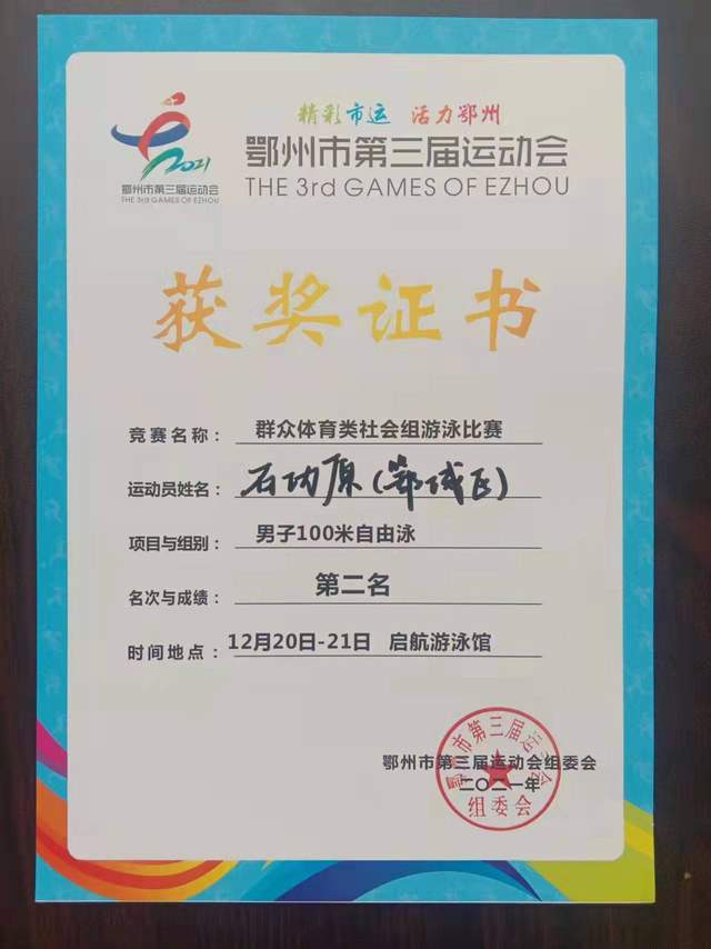 2021年12月20日,鄂州市第三届运动会群众体育类游泳比赛在鄂州启航游泳馆举行,代表鄂城区参加比赛的游泳健将石功原顽强拼搏,分别夺得男子社会组100米自由泳,男子社会组 200米 自由泳两个组别的亚军。