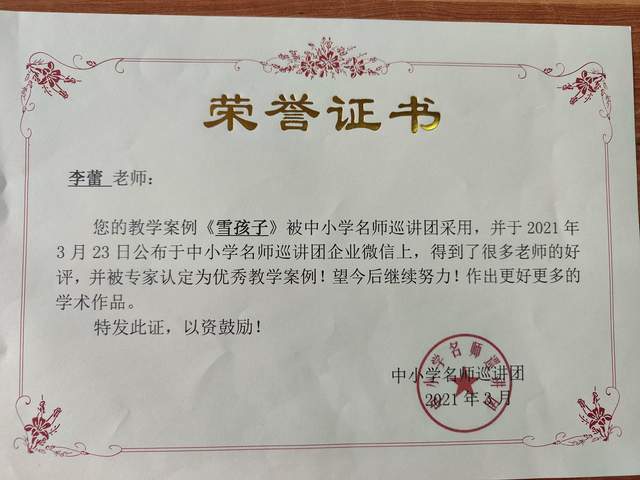 在邢老师的带领下,我一路走来,经历过挫折,积累了宝贵的经验,同时收获了很多成果:今年3月份,教学案例《雪孩子》被中小学名师巡讲团评为“优秀案例”;5月,《抓文眼,促阅读》一文在《语言文字报》发表;6月,《叩响童话的大门》一文在《语文报》发表;7月,《遇见早春》一文在《都市头条》、《诗意人生》、《极光文艺》联合举办的“诗意人生”原创文学大赛中获得佳作奖;11月,《巧用留白,生发想象》一文在山东教育社举办的“百佳”论文大赛中获得三等奖;12月,《摘星星的少年》一文在“趣语·高效读写”专家组举办的“党的光辉照我心”师生征文活动中荣获一等奖;同月,《在“意外”中收获》一文在《语言文字报》上发表。是邢老师的严格要求、悉心鼓励、不断鞭策、耐心指导成就了今天的我。作为回馈,我认为,我们青年教师最应该做的就是快速提升自己,同时将邢老师“反思——总结——成长”的理念传承下去,并以此带动学生的成长。