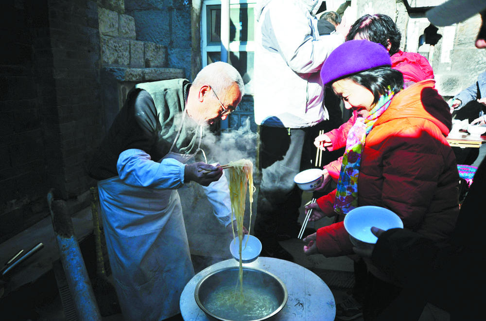 今年77岁的吴福新,手擀拖刀面已40多年,是拖刀面的第六代传人,近年来,经常受聘于一些知名景点进行拖刀面制作表演。近日,记者在桃核园村西街11号吴家小院里见识了吴福新的精彩表演,十几名慕名前来的市民品尝了拖刀面。拌上传统豆腐白菜卤的拖刀面,令人唇齿留香,回味无穷。