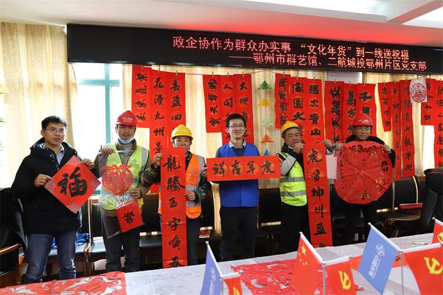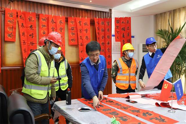 活动后,鄂州片区党支部书记段爱华、鄂州三中心项目公司总经理胡江焕、三中心项目部书记王凌飞作为代表,带着墨香四溢、饱含祝福的作品赶赴项目部办公场地和新庙镇马元村。纸张轻盈,又因大家的祝福、建好项目的初心。贡献鄂州的初心而变得厚重,工人和村民们接过这些暖心得“文化年货”,幸福的心情也溢于言表。段爱华说“2021年是我们埋头苦干、抢抓机遇的一年,项目公司和项目部团队在各方的大力支持下凝心聚力、打开局面,要特别感谢团队的伙伴们和现场的工人兄弟们。隔离不隔温暖、疫情不阻温情,祝福大家百病不侵、健康顺利,祝福项目建设平安高效,2022我们笃行不怠、勇毅前行!”他还特别留了一份“文化年货”给从河南许昌返鄂正在隔离的工友王堃。