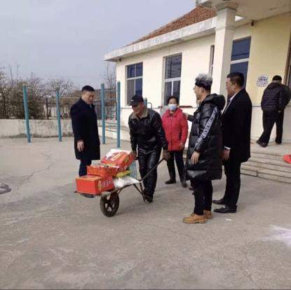 (被帮扶的村民手推车领取春节慰问品六件套)
