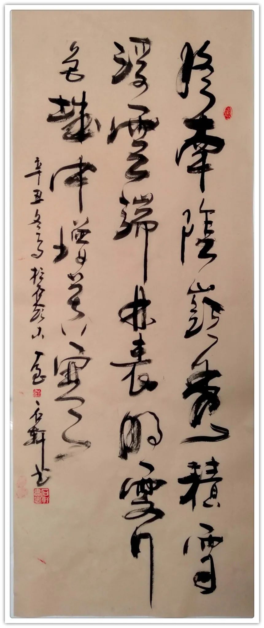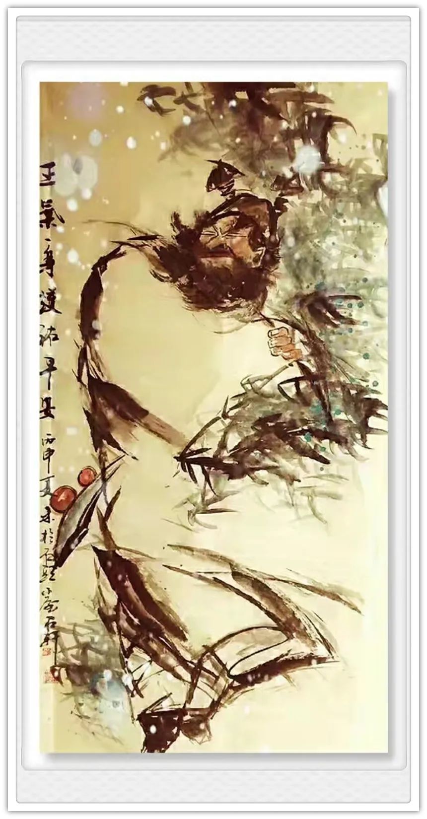 他创作的《果实累累》、《花开富贵》、《暗香浮动》等国画作品,色彩斑斓,布局饱满,给人以清新自然、古朴广博、新颖灵动的感觉。观郭石轩老师的国画作品,不但画的题材宽广,花鸟,动物,山水草木等均有涉猎,并下笔如有神助;而且其画风纯正,心随笔运,神思迭出,不落窠臼,毫无刻板、呆滞之感,整体画面给人干净利落的视觉享受。更进一步说,从画理上,他也摆脱了形的纠缠,已达到形而上的境界。因之,他的画作中,屡见巧拙相参,拙而能巧,时出奇趣,峰回路转之佳品。如《大吉图》、《富贵吉祥》、《锦上添花》、《鹰击长空》、《寿比南山》、《风光不与四季同》等作品,构思奇绝,灵气十足,神韵俱备,令人观之无不心旷神怡。在简练的笔墨、造型、设色中,将一个个动物的神态,一枝枝花草的神韵表现得淋漓尽致,足使雅俗共赏,先睹为快。“画到精神飘没处,已无真相有真魂”,历代书画前贤的艺术理念在郭石轩老师的头脑中已深深扎根,必然使得他洒脱老道的画笔下将呈现出更多更美的优秀作品。