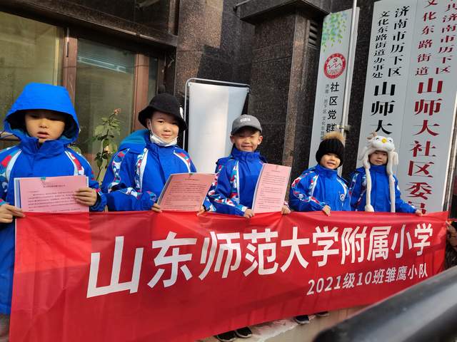 山师附小2021级10班的雏鹰宝贝李皓霖、李涛旭、鲁珂飞、刘雨卓、亓晞航同学在新学年第一次接到任务后,不畏冬日严寒,积极参与,广泛宣传,1月27日走入山师大社区,通过向过往群众发放禁燃宣传单的方式,进行禁燃宣传教育,提升大家认知,积极引导广大家长作禁燃烟花炮竹的践行着、宣传者、监督者。小雏鹰们在社区街道上向行人发放倡议书,他们脸上略带腼腆但却洋溢着兴奋和激动,一边发放一边认真的为每一位接过宣传单的叔叔阿姨讲解燃放带来的危害和倡议书的意图。
