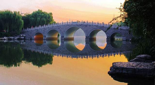 这些桥有的拱身浑圆,有的规矩方正;有的精致讨巧,有的恢弘大气;有的古朴典雅,有的摩登现代;有的绿树掩映、身影婆娑, 有的傲然屹立、姿态绰约……如果是在朝烟暮蔼之际,整个明湖烟水空濛、水汽缭绕,小桥恰似美丽的彩虹出没其间,极尽烟雨缥缈之趣,令人流连忘返。