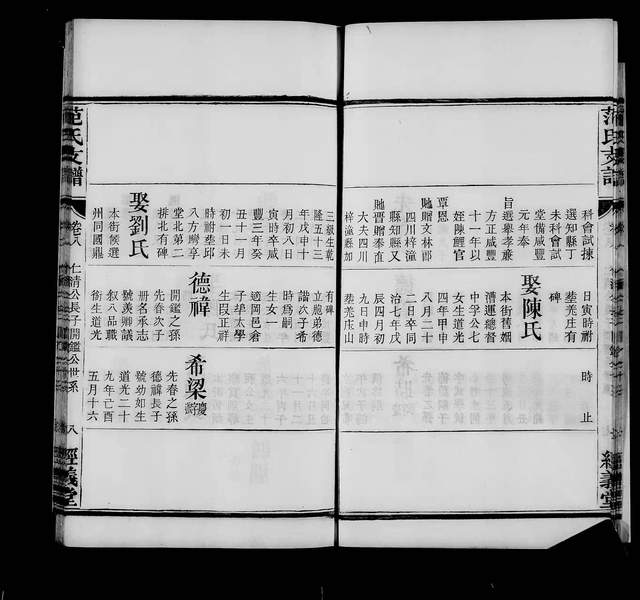 范氏家族与本乡联姻则更多,至今葛店街头流传有“陈范不分家”之语。陈、范这两个家族世居葛店街,屋宇毗邻,和睦相处,双方都有重教兴族的传统,陈氏家族以仕宦著称,而范氏则以文化立世,齐名遐迩。查《范氏宗谱》,范氏家族子弟娶陈氏联姻约有十代,最少有数十人。最有趣的是范廷鉴的孙子六人与陈家联姻,范陈鲤娶了漕运总督陈中孚次女、范赐鲤娶了他的七女、范际鲤娶了他的八女。范德庆娶了陈中乾的次女、范德敏娶了陈中升的女儿、范德昉娶了陈抗希的长女。其中范先荣、范先春、范先恩三位嫡亲兄弟与漕运总督陈中孚为儿女亲家,④这种联姻状况与地位权势不无关联,有利于双方门第势力在当地的扩张,反映出婚姻选择上强烈的功利性色彩。