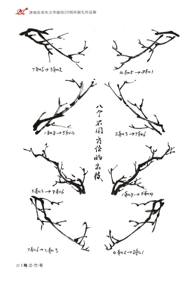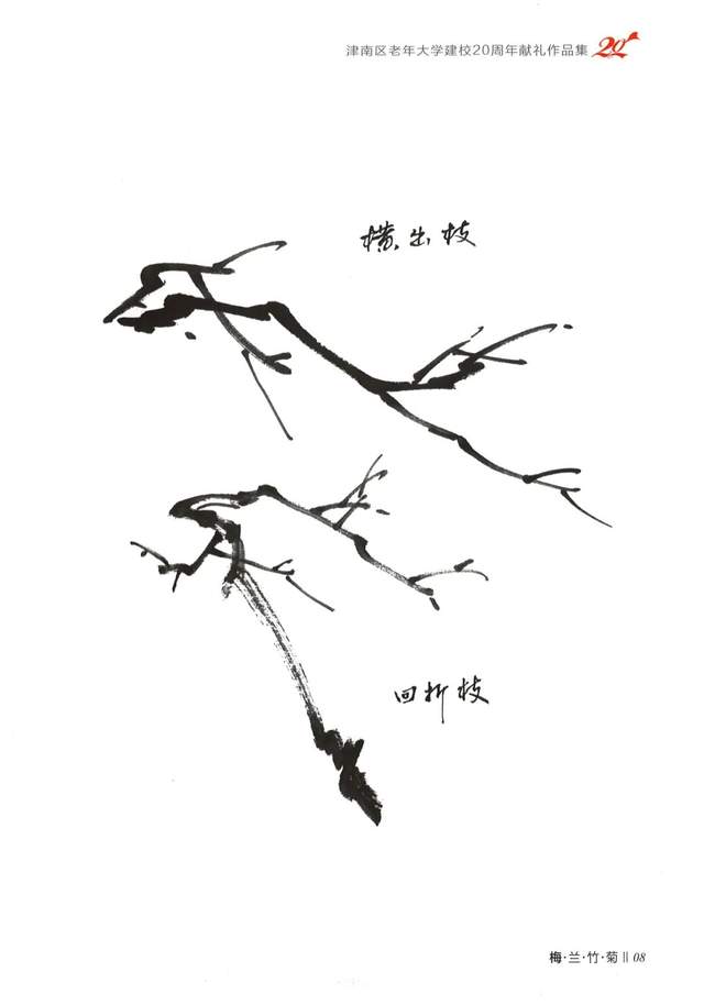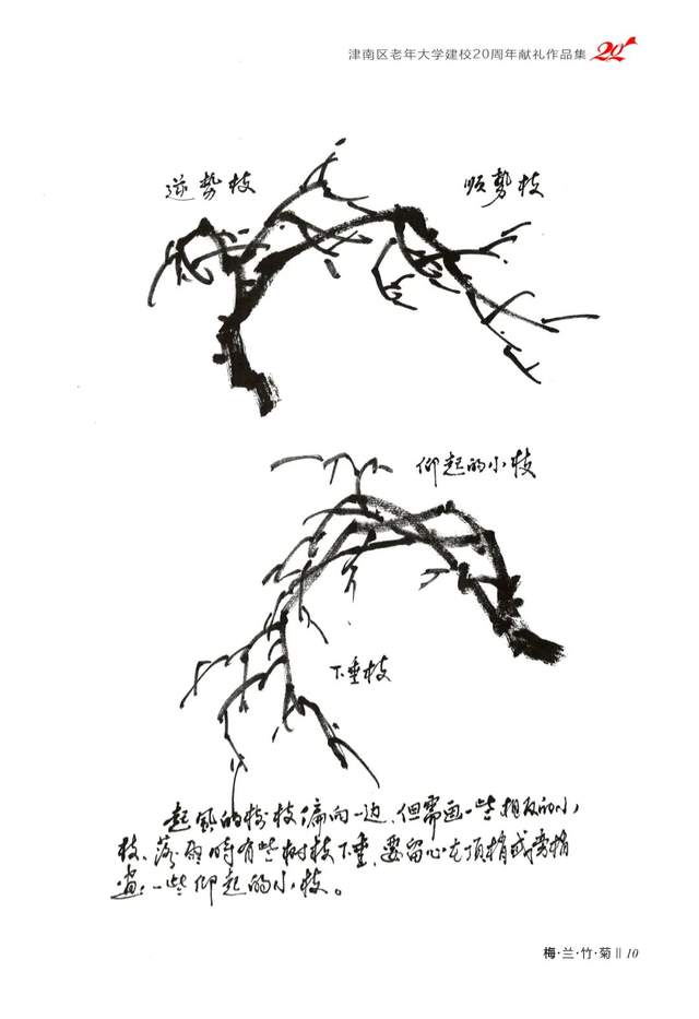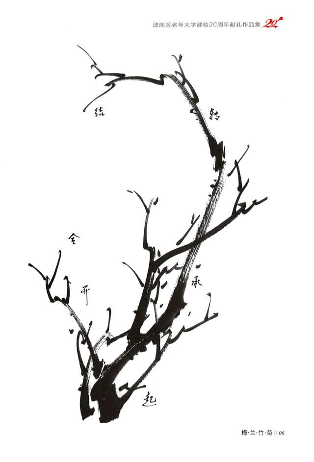 梅花枝干的造型,要体现和天地而成形的规律,线条要表现出“快与慢”“方与圆”“动与静”“强与弱”“轻与重”“刚与柔”的用笔节奏韵律,这也是画线的一种要求。