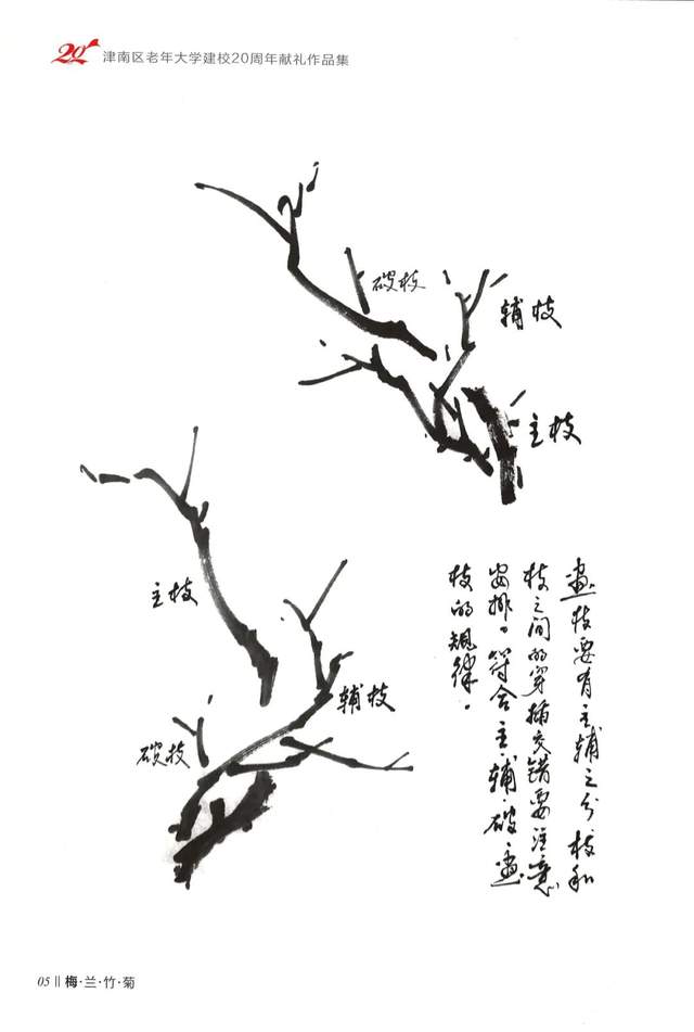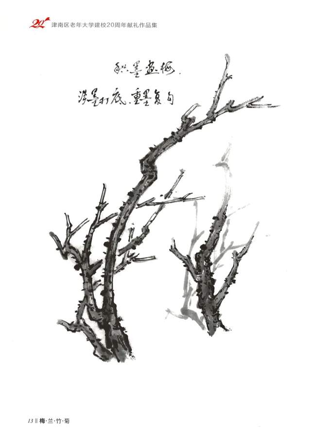 枝干的用墨要体现出“湿中有干、干中有湿”“虚中有实、实中有虚”,干而不燥、湿而不执。墨的运用要体现出像行云流水一样的“云水风度”枝干的穿插要体现出主、辅破、长短破、三个基本造型的原则使画面的构图立意丰富。
