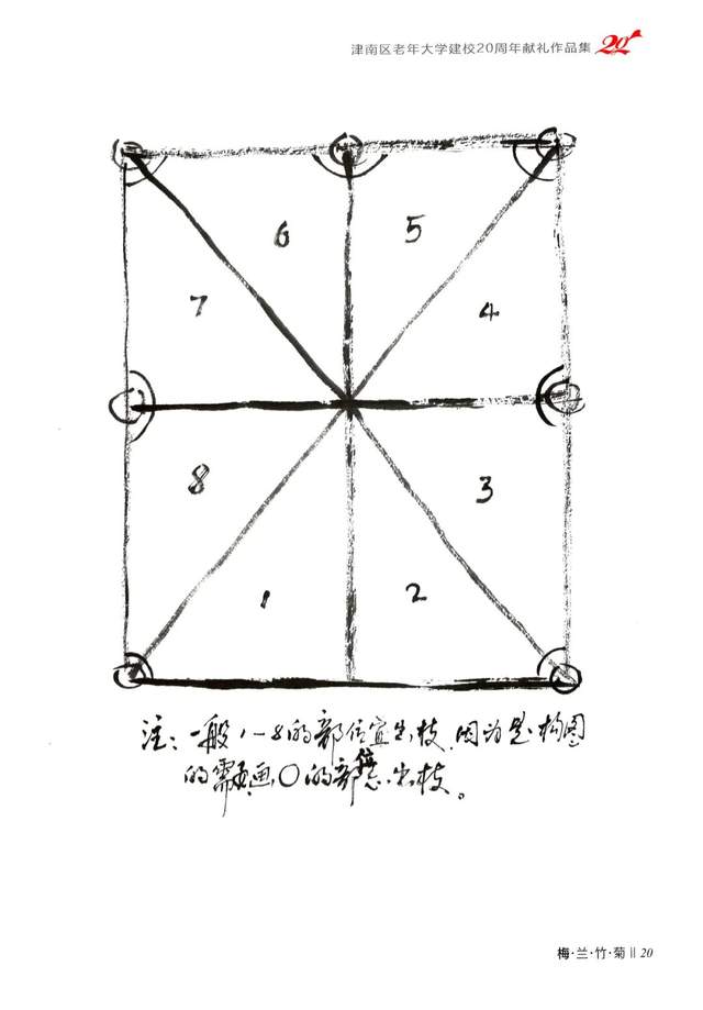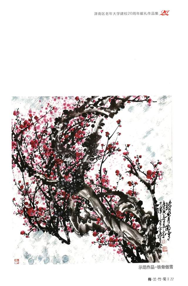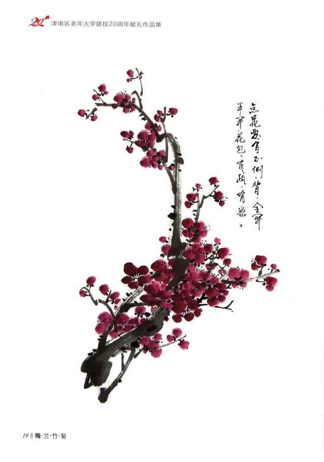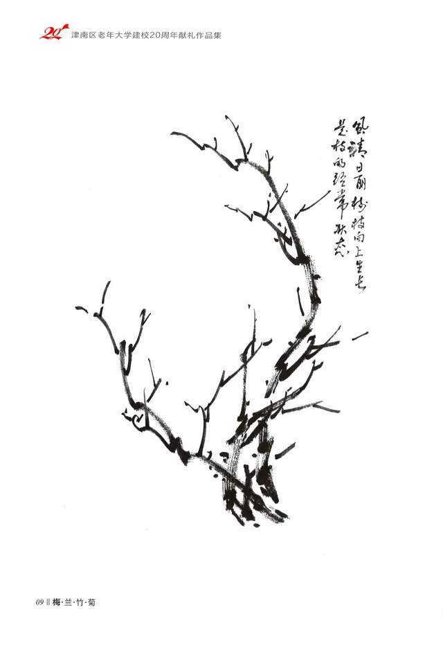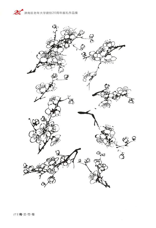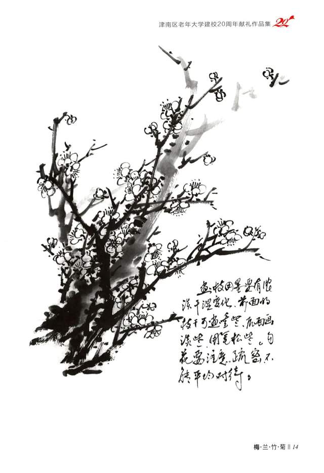 点花要点在小枝上,体现出正、侧、全开、半开及花蕾的组合,有疏有密,有重有轻。像画云一样的起伏、连贯,表现出傲雪怒放的精神。