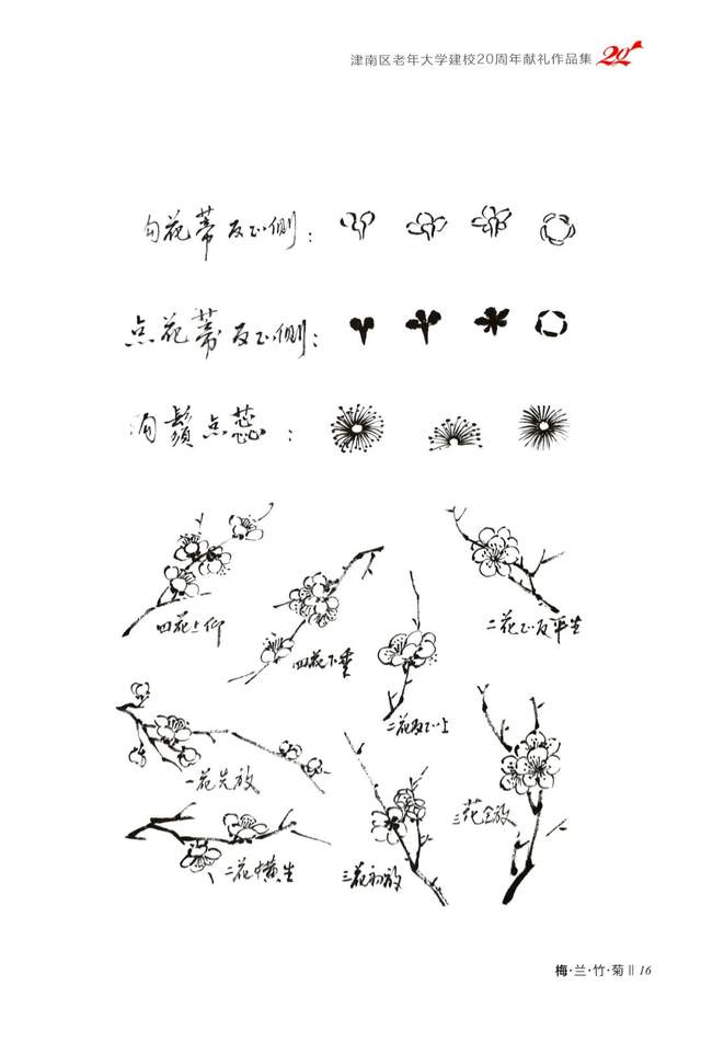 教材中分别附有四种花的示范作品,画作恬静雅致,艳而不俗,各具韵味,给人以美的享受和启迪。供习者在学习欣赏的同时,体会梅·兰·竹·菊品格特征,产生情感上的共鸣。