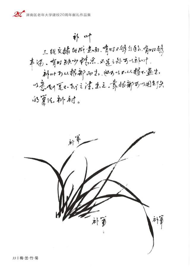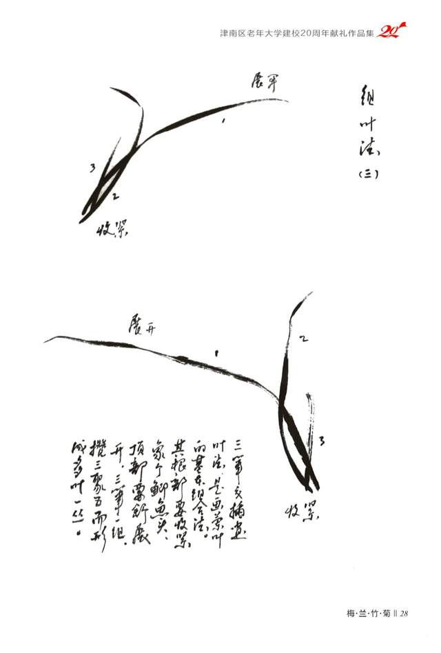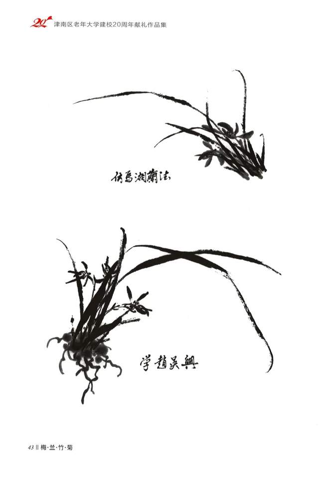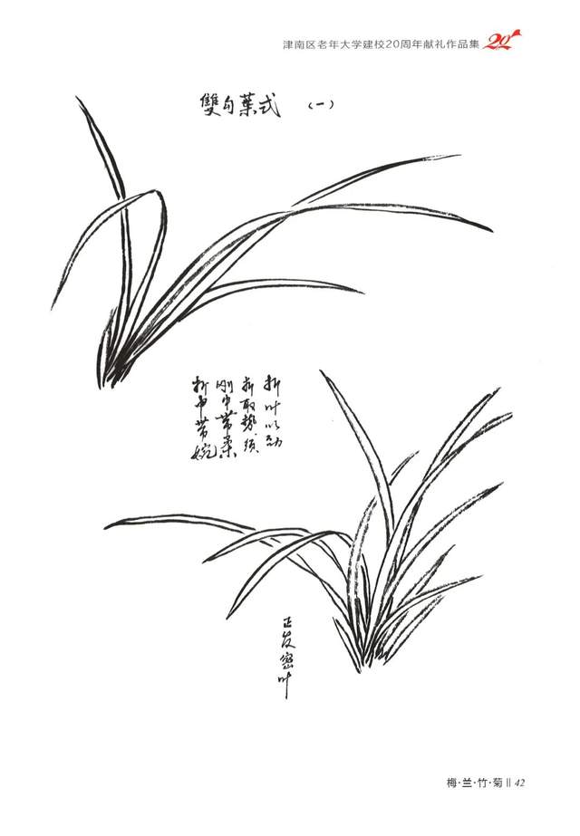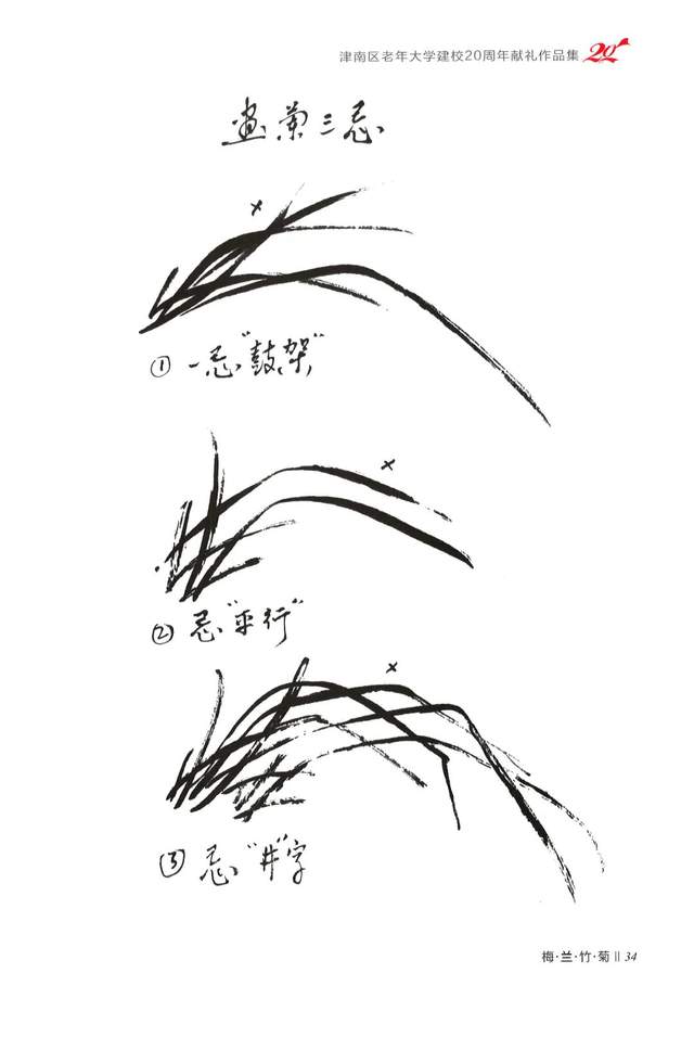 画兰花有一个口诀:“一笔长、两笔短、三笔破凤眼”画一笔兰花叶,有一个动作,就是行笔中的提按动作行笔有提有按,到尖端的时候有结,力量送到底,行笔时笔锋铺开收拢,一按一提、一开一合,要理解这种用笔的方法。线条要有力度,要过力量关,线条才能有弹性没有力量神韵出不来,要刚中有柔,柔中带刚,刚柔相济;线条要方中有圆、圆中有方、曲里有直、用笔流畅。线条有弹性,要求有内在的美,根部像鱼头,“收”不能散,在出叶子时不能都放在其根部,穿插时注意不要三线交叉一点。左撇右撇同时练,做到运用自如,画