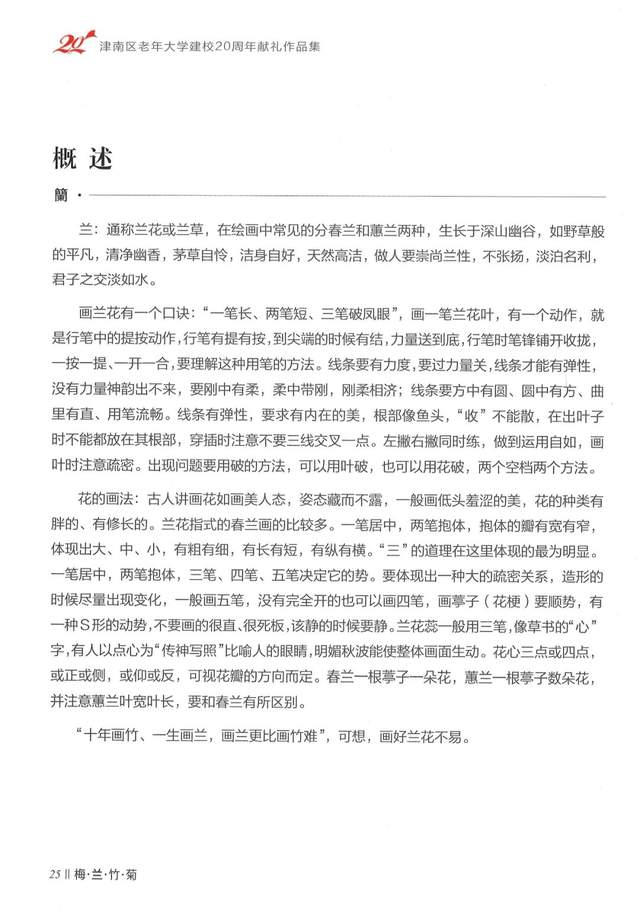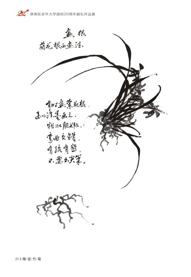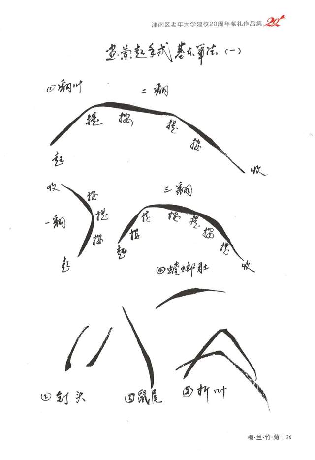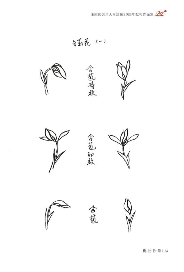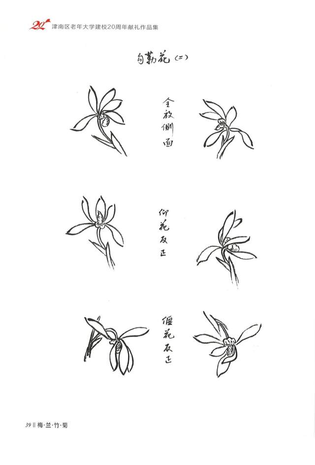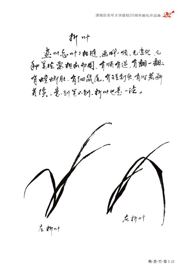 画兰花有一个口诀:“一笔长、两笔短、三笔破凤眼”画一笔兰花叶,有一个动作,就是行笔中的提按动作行笔有提有按,到尖端的时候有结,力量送到底,行笔时笔锋铺开收拢,一按一提、一开一合,要理解这种用笔的方法。线条要有力度,要过力量关,线条才能有弹性没有力量神韵出不来,要刚中有柔,柔中带刚,刚柔相济;线条要方中有圆、圆中有方、曲里有直、用笔流畅。线条有弹性,要求有内在的美,根部像鱼头,“收”不能散,在出叶子时不能都放在其根部,穿插时注意不要三线交叉一点。左撇右撇同时练,做到运用自如,画