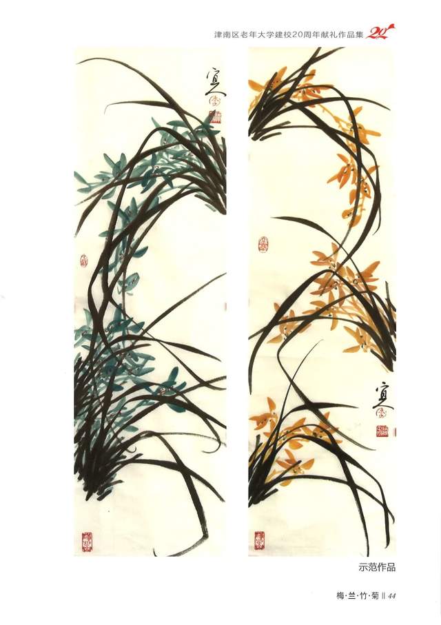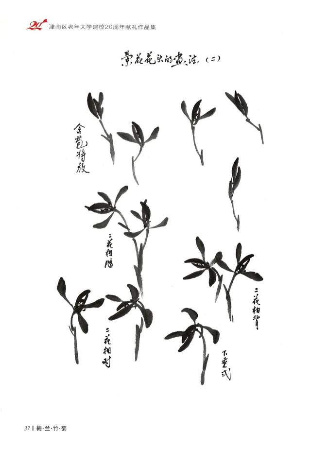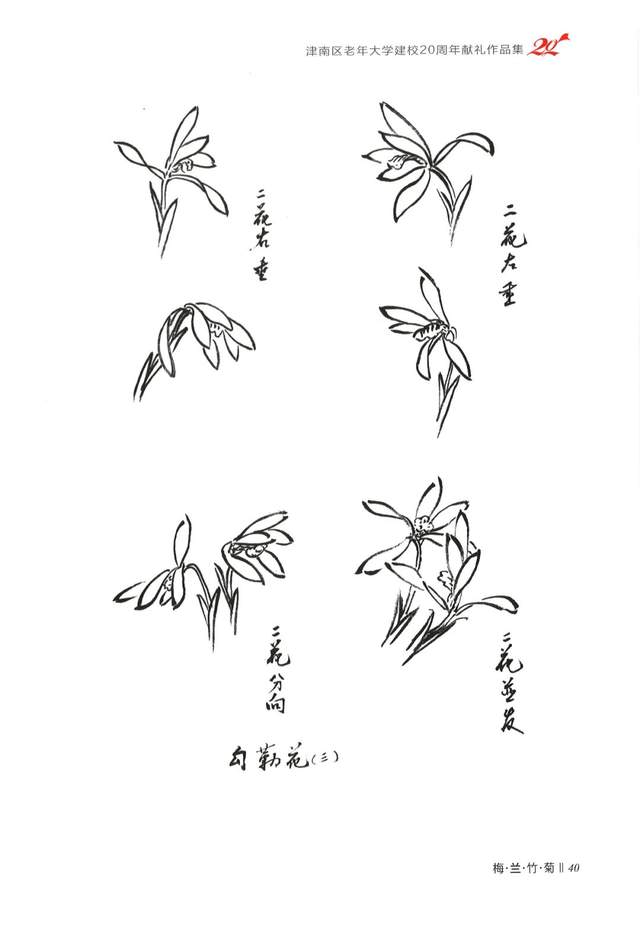 花的画法:古人讲画花如画美人态,姿态藏而不露,一般画低头羞涩的美,花的种类有胖的、有修长的。兰花指式的春兰画的比较多。一笔居中,两笔抱体,抱体的瓣有宽有窄体现出大、中、小,有粗有细,有长有短,有纵有横。“三”的道理在这里体现的最为明显。一笔居中,两笔抱体,三笔、四笔、五笔决定它的势。要体现出一种大的疏密关系,造形的时候尽量出现变化,一般画五笔,没有完全开的也可以画四笔,画莘子(花梗)要顺势,有一种S形的动势,不要画的很直很死板,该静的时候要静。兰花燕一般用三笔,像草书的“心”字,有人以点心为“传神写照”比喻人的眼睛,明媚秋波能使整体画面生动。花心三点或四点或正或侧,或仰或反,可视花瓣的方向而定。春兰一根葶子一朵花,蕙兰一根葶子数朵花并注意蕙兰叶宽叶长,要和春兰有所区别。