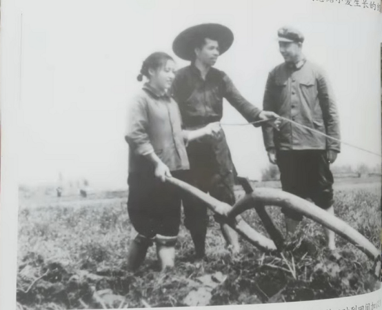 20世纪70年代,刘景荣在大田里监督鼓励女儿刘锋向农民伯伯学习扶犁耕田技术。