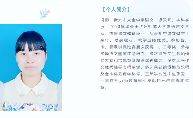 幸福是孟郊的“慈母手中线,游子身上衣”,幸福是孟浩然的“春眠不觉晓,处处闻啼鸟”,幸福是陆游的“山重水复疑无路,柳暗花明又一村”,幸福是高鼎的“儿童散学归来早,忙趁东风放纸鸢”,幸福是李商隐的“春蚕到死丝方尽,蜡炬成灭泪始干”。身为一名青年教师,工作十余载,让肖丽老师来告诉你什么是幸福。