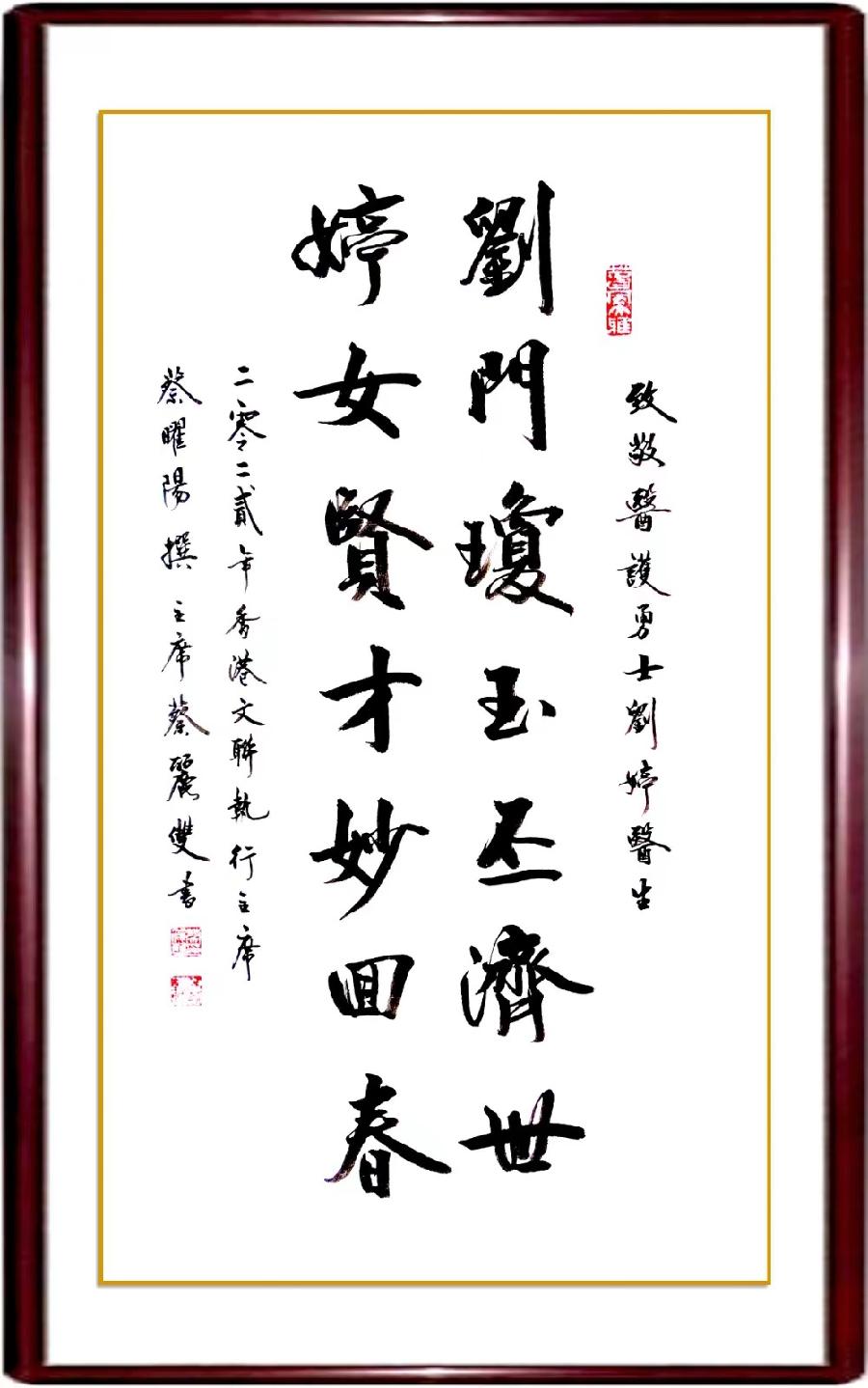 抗疫先锋苏铭叶护士,为了驰援香港,义无反顾地把双方父母亲千挑万选的婚礼推迟,随身携带定情信物来香港相伴,无私奉献的精神,令人肃然起敬。香港市民为之深深地祝福,为之撰书嵌名联:「铭德增勋知使命;叶荣蕃茂衍高风」!
