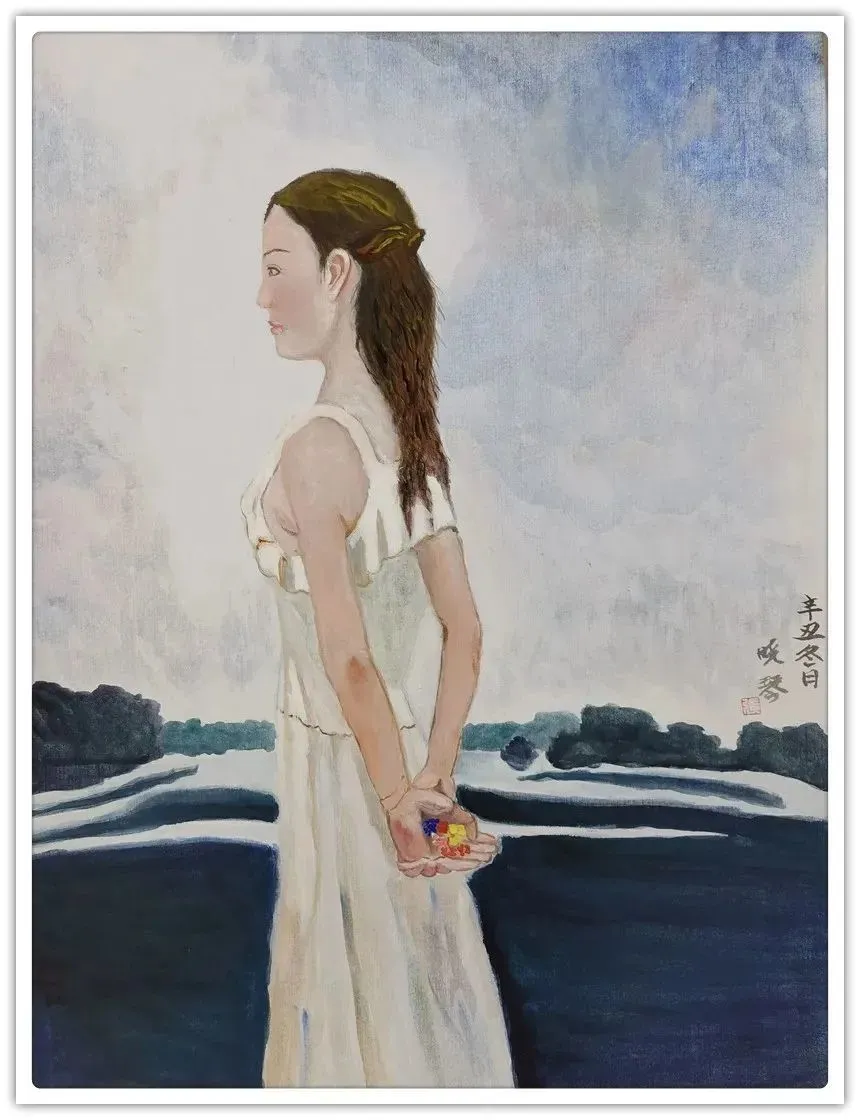 她把中国画的线质交付给油画创作,不显得违和,这是因为她练习描线法度很用心,掌握线条造型的功夫也很到位,工笔人物画已经达到了描线精确,传神准确的境界。反之,油画的光影技法转迁给中国画创作,显得天衣无缝。这是因为她历练油画技法,把古典主义风格习成的很扎实,光影作油画游刃有余,转迁作山水,也可以遂手应手。中国画里介入光影效果,强化了中国画的形神质量,有笔墨当随时代的考量。