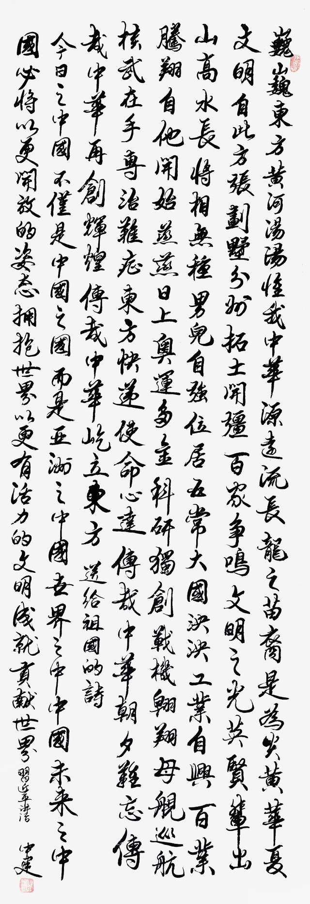 书法艺术作为中国特有的文化现象,随着社会进步与发展,其创作观念,交流方式,审美需求等与古代相比已发生了较大变化,书法只有是大众文化,才会成为精英文化;书法只有表达真情实感,才能让人动心悦情;书法只有在继承传统特色中变化,才能具有生命力,成为持久不衰的艺术。所以书法家只有具备了服务社会意识,有高尚的人格精神,才能体现文化核心价值,才能起到教育社会作用。我认为,黄中建的书法艺术创作,走的正是此道路。愿人书俱老的黄中建在他的艺术天空中,夕阳红似火,彩霞溢漫天。