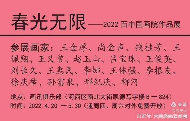 天津書画艺术网讯:(徐庆举 /柳河报道)"春光无限一一2022百中国画院作品展"于4月20日上午在位于河西区南北大街1号天津湾凯德写字楼B座824的画讯俱乐部揭幕。因疫情防控要求,本次画展不举行开幕式,开幕当天也没有对公众开放,代之以百中国画院的书画家和受邀嘉宾在一起座谈,这也是百中国画院书画家们在天津发生疫情后的首次交流活动。