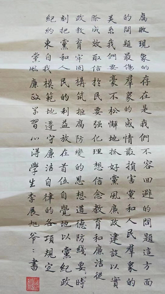 班会课上,各班主任通过一个个廉政小故事、名言警句、廉政诗词等对同学们进行警示教育宣传,同学们用诗歌、朗诵、歌唱的方式宣传廉政文化,之后一首《守住清廉》将主题班会推向高潮。除此之外,学校还通过“读一本廉洁文化的好书”、开展一次“崇廉敬德”手抄报及教师书画比赛等多举措宣传廉政文化,一幅幅栩栩如生的书画、一句句发人深省的名言警句、一首首脍炙人口的廉政佳作……对孩子们进行了正面引导和反面警示教育。
