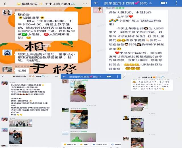 为了全方位开展周末“线上活动”,老师们假期不休息,根据《3—6岁儿童学习与发展指南》中的幼儿发展目标、年龄特点,认真准备,分组开展多样线上游戏活动。小班的活动内容有儿歌、童谣、手指游戏、亲子运动,中大班活动内容包括手工绘画、亲子运动、绘本故事、科学小实验等等。教师们引导家长在家与孩子一起互动、游戏,让宝贝们在假期中养成良好的生活、学习习惯。
