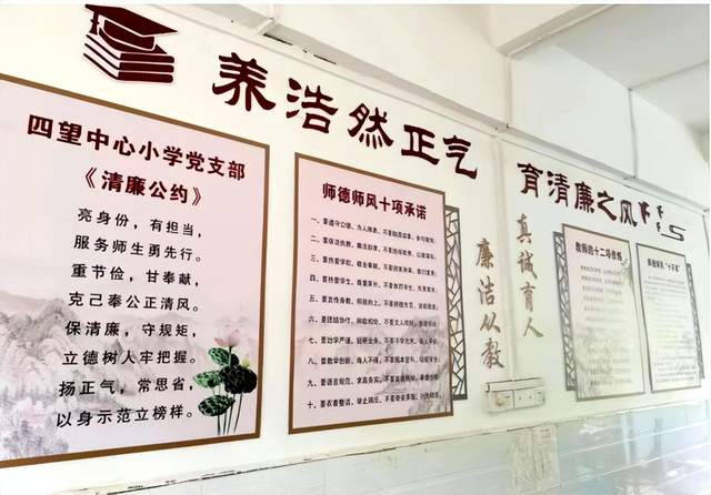 为深入推进全面依法治教,认真落实立德树人任务,创建“清廉学校”。今年以来,四望镇中心小学立足实际,坚守疫情防控和营造清廉校园建设两手抓,两手硬。从完善廉洁管理制度,打造廉心师生团队,让廉洁成为学校的文化底色,以坚持“好正实优”清廉目标,以“清明政风、清净校风、清正教风、清新学风”四大工程为目标,努力打造清亲气正的文明校园、学习乐园、精神家园。
